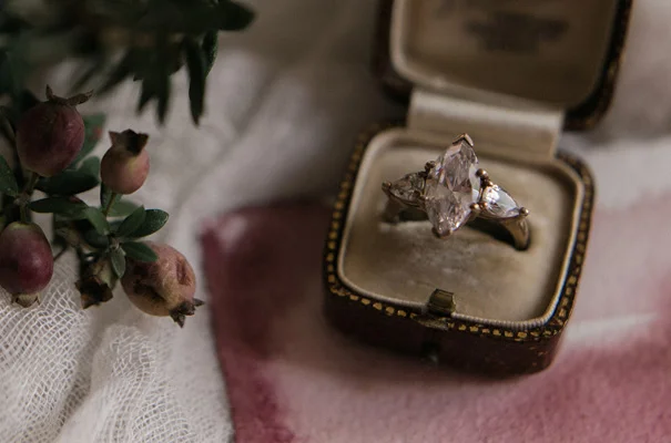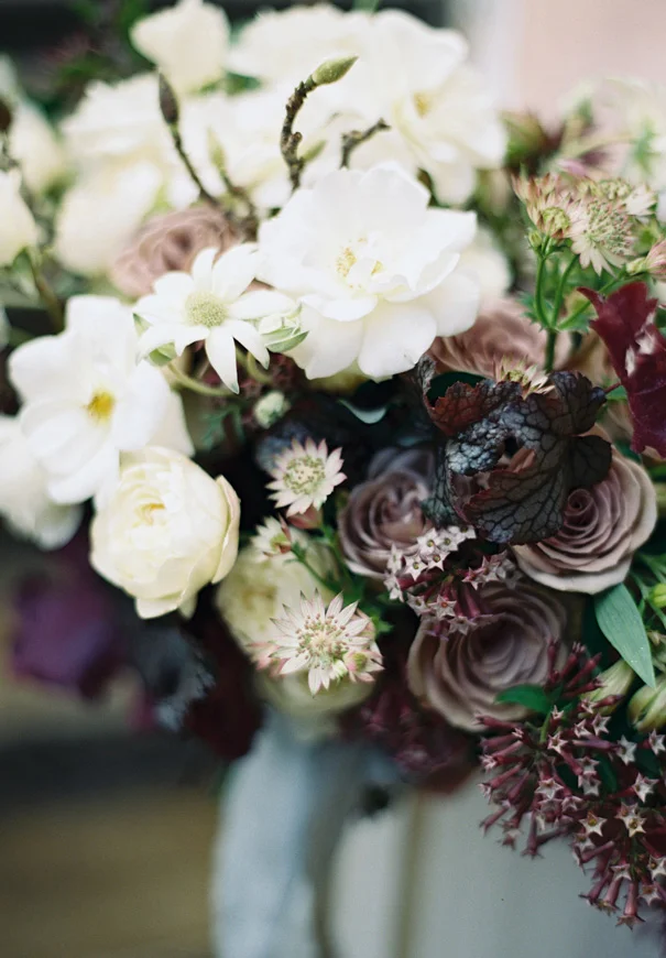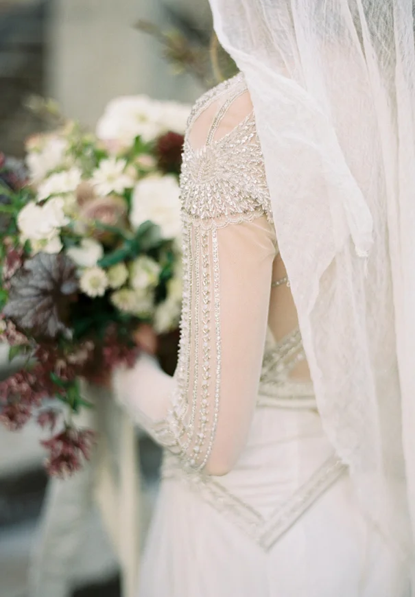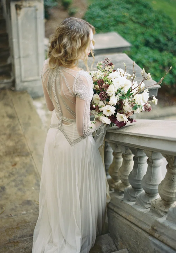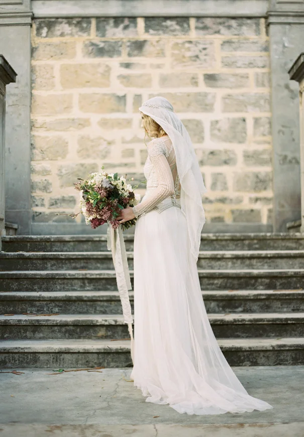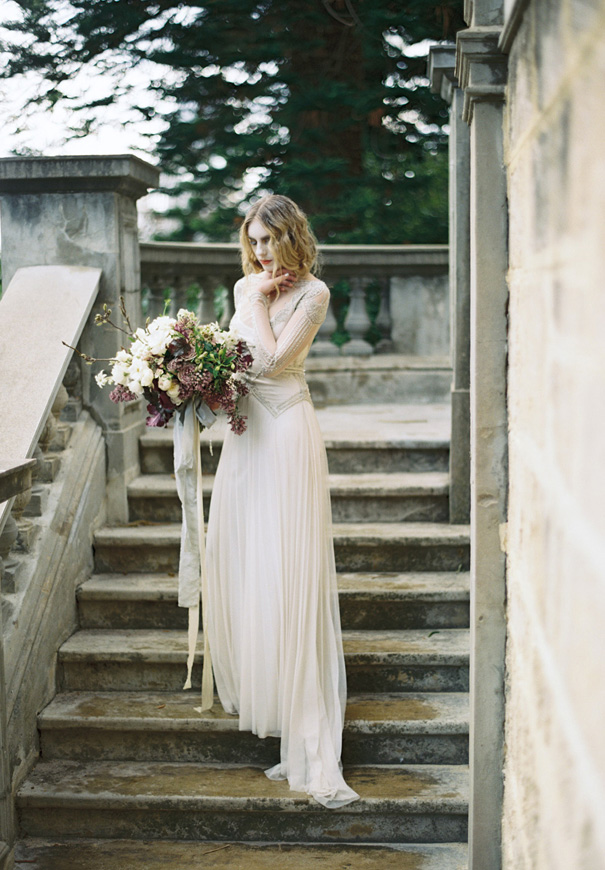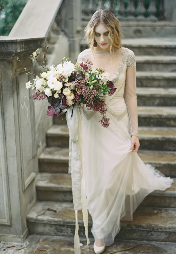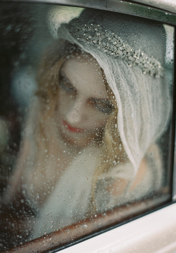 Inspired by estranged lovers and unrequited love, Haunted Bride, shot by Katie Grant Photography, depicts the “artful beauty of the lost, the pained, the broken.” Photographed during the turn of the seasons, amongst the falling Autumn leaves and rain drops, beautiful gowns by Gwendolynne were paired with delicate accessories by Bride La Boheme to create a poignant kind of unconventional beauty.