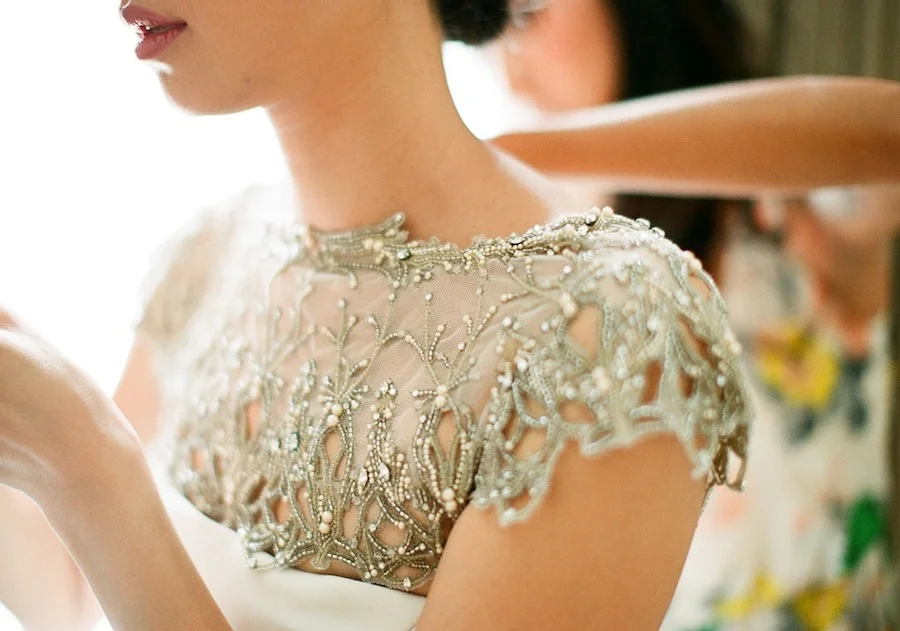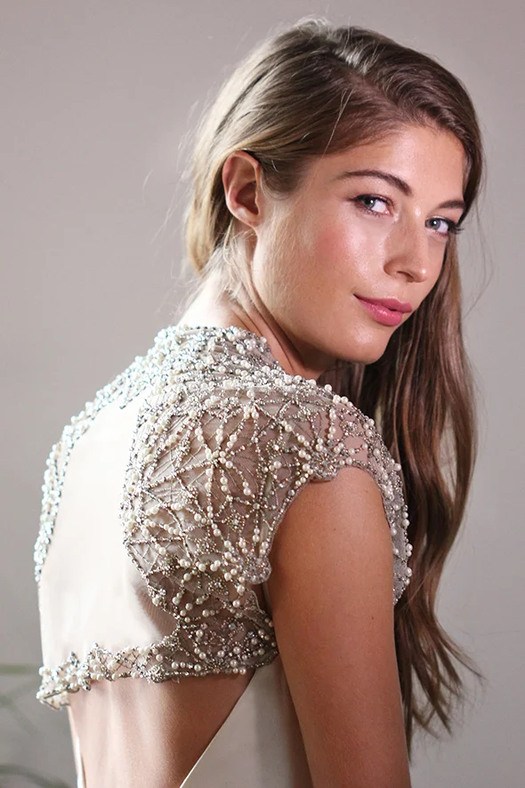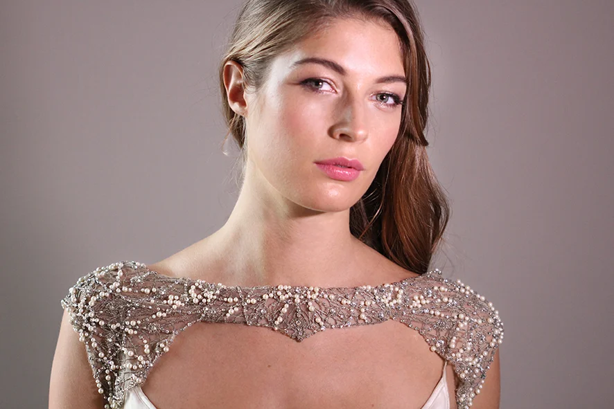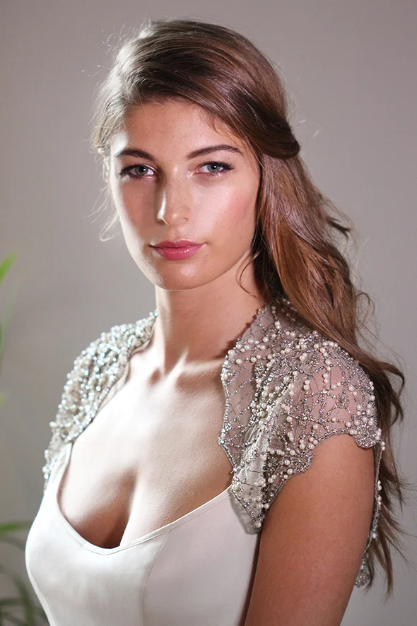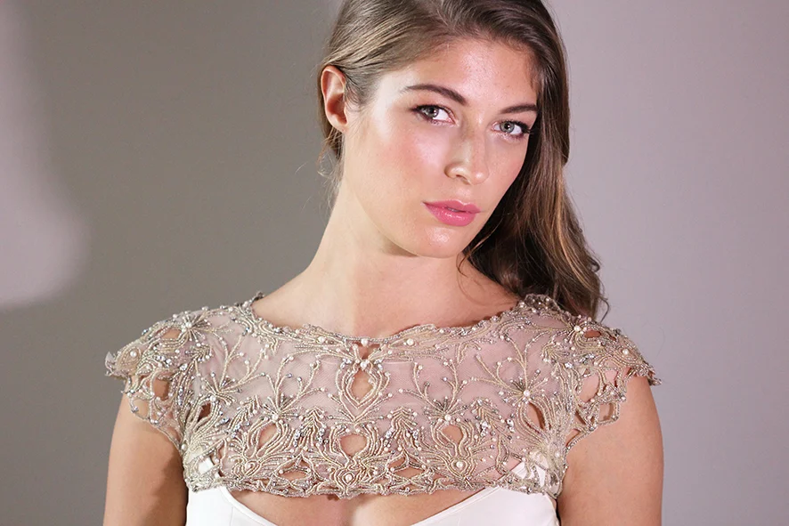 Our boleros embody the idea of versatility, allowing you to enjoy their design on multiple occasions. They are particularly suitable for brides who reside far away and face challenges in visiting our atelier for fittings, or for those on a tighter budget. This allows you to obtain some of our exquisite signature beading even from a distance, catering to individuals with time constraints or travel limitations.